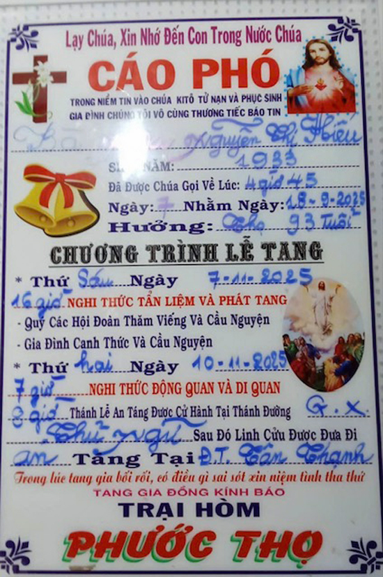 Nhận được tin buồn từ Gia Đình QGNT-SG, thân mẫu của anh Nguyễn Kim Phát (Q72), Cụ bà Anna Nguyễn Thị Hiếu đã từ trần vào lúc 04 giờ 45, ngày 07 tháng 11 năm 2025, tại Việt Nam, hưởng thượng thọ 93 tuổi.