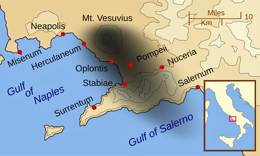 Pompeii và các thành phố khác bị ảnh hưởng bởi vụ phun trào của Núi Lửa Vesuvius. Đám mây đen tượng trưng cho những nơi bị tro và than bao phủ.