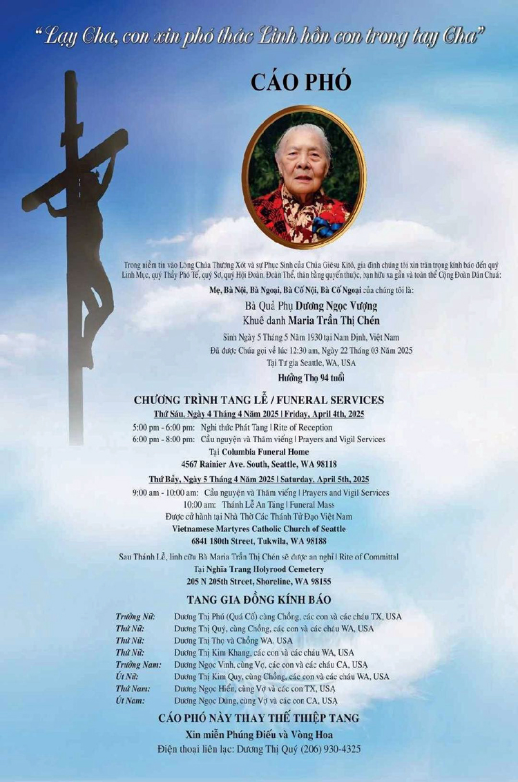 Nhận được tin buồn, thân mẫu của chị Dương Thị Quý (Q72), Cụ bà Quả phụ Dương Ngọc Vượng (Khuê danh Maria Trần Thị Chén) đã từ trần vào lúc 12 giờ 30, ngày 23 tháng 03 năm 2025, tại thành phố Seattle, tiểu bang Washington, USA, hưởng thượng thọ 94 tuổi.