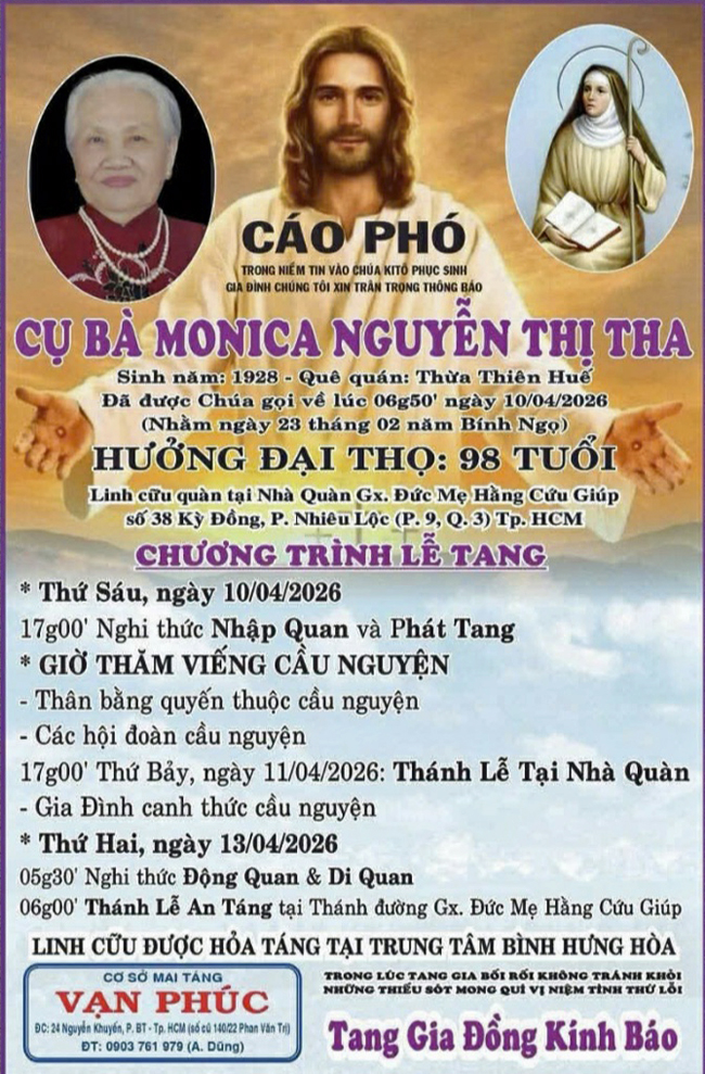 TIN BUỒN Trong Niềm Tin Vào Chúa Kitô Phục Sinh. Gia Đình QGNT(SG) trân trọng báo tin. Thân Mẫu của Chị Nguyễn Thị Thanh Nhàn (Q74). Cụ Bà Monica Nguyễn Thị Tha. Sinh Năm: 1928. Đã được Chúa gọi về lúc 06h50 Ngày 10/04/26. Vì tuổi già sức yếu!! Hưởng Đại Thọ: 98 Tuổi. Kính Mời Quý ACE cố gắng sắp xếp đến thăm viếng, tiễn đưa Mẹ Q lần cuối! Vào lúc 16h00 Ngày 12/04/26. Thành Kính Phân Ưu cùng Gd Chị Thanh Nhàn (Q74). Cầu nguyện linh hồn Monica Nguyễn Thị Tha sớm hưởng Nhan Thánh Chúa!! Ps- Linh Cửu quàn tại: Nhà quàn GX Đức Mẹ Hằng Cứu Giúp. 38 Kỳ Đồng. P Nhiêu Lộc- HCM. Kính Báo