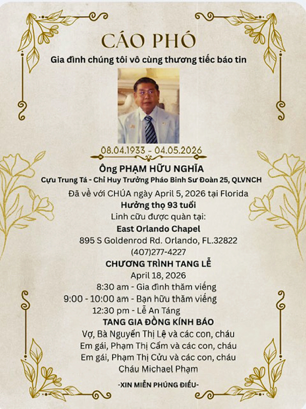 Nhận được tin buồn, phu quân của Chị Nguyễn Thị Lệ (Q71- Cựu Nữ sinh Nội Trú Q), Anh Phạm Hữu Nghĩa, đã mệnh chung vào ngày 05 tháng 04 năm 2026 tại Florida, USA hưởng thượng thọ 93 tuổi.