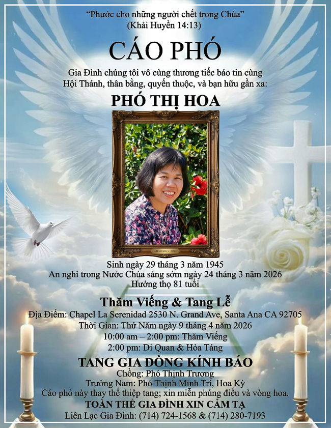 Thành Kính Phân Ưu Cùng Anh Phó Thịnh Trương Và Tang Quyến. Xin Thiên Chúa Toàn Năng Nhân Từ Đón Nhận Linh Hồn Chị Phó Thị Hoa Về Nước Ngài. GĐ Phạm Oanh
