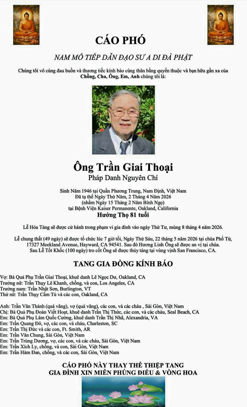 We have been deeply comforted by the kind words you have shared about our beloved father, Thoai G. Tran. We would be honored to have you join us to commemorate his life on the weekend of May 22–23, 2026. Please find below the details on the Buddhist 49th Day Memorial on May 22 and Celebration of Life lunch on May 23. We kindly request an RSVP for the lunch by May 10. 49th Day Memorial for Thoai G. Tran In Buddhist tradition, the 49th day after death marks the end of an important transitional period for a loved one’s consciousness. It represents the period when the soul is reborn. Buddhists believe actions performed by the living can help the loved one during this transition. The actions help the spirit move peacefully onward. The Tran family will perform weekly rituals during these 49 days to support our beloved’s journey. The 49th Day Memorial and Celebration of Life for Thoai G. Tran on the weekend of May 22-23 will honor his life, the completion of his transition, and his rebirth. Friday, May 22, 2026, 7:00-8:00 PM 49th Day Memorial Service Pho Tu Buddhist Temple (Chua Pho Tu) 17327 Meekland Ave., Hayward, CA 94541 https://maps.app.goo.gl/XHmdwgFSX6nYS6FM6?g_st=ic (Conducted in Vietnamese. Attendance is optional.) Saturday, May 23, 2026, 11:00 AM - 2:00 PM Celebration of Life Lunch Pacific Lighthouse Restaurant 1051 Pacific Marina, Alameda, CA 94501 https://maps.app.goo.gl/4NHHhxZoWBHnfJHy9?g_st=i RSVP by May 10 We are preparing a slideshow for the Celebration of Life. Please feel free to email us photos and short videos or upload them to this link: by May 10 We also invite you to bring memories to share during the lunch or printed photos to include in a memory book for his grandchildren. The Tran Family Contact Info Tu Tran 415-378-5719 Le Tran 703-869-6808 Background on the Buddhist 49th Day Memorial: Understanding the 49 Days of Mourning (https://mbtchicago.org/ask-rev-todd-2024-09-03/) The Significance of Rebirth in Buddhism (https://nirvanamemorialsg.com/what-is-the-49-days-of-mourning-in-buddhism/)