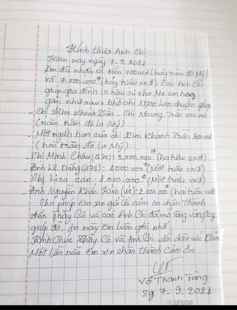 4/ Chúng Tôi đă nhận và chuyển số tiền 7.000.000 Bảy triệu vnd) đến con Cô. Bao gồm danh sách dưới đây: - Minh Châu Q75 3.000.000 ( ba triệu vnd). - Lê Dũng Q75 1.000.000 (một triệu vnd). - Lisa Cao (Úc) 1.000.000 (Một triệu). - Anh Nguyễn Khắc Ḱnh 2.000.000 (hai triệu vnd), Tc 7.000.000 (Bảy triệu vnd). Ps: 700 (bảy trăm đô la Mỹ) và 7.000.000 (bảy triệu vnd) = 22.643.000. (Hai mươi hai triệu sáu trăm bốn mươi ba ngàn vnd).