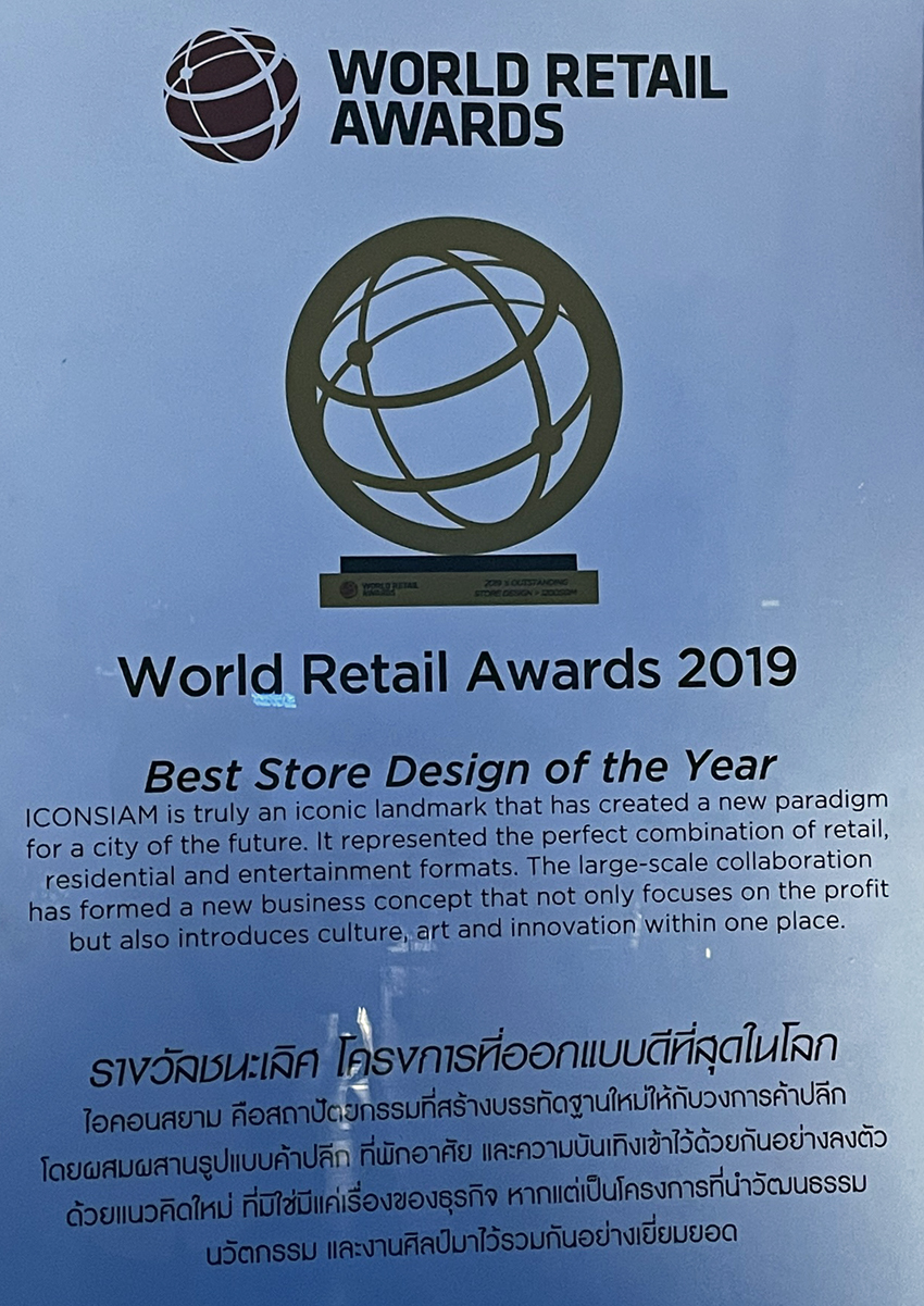 Khu ICONSIAM được nhiều giải thưởng quốc tế về design cho một khu hỗn hợp gồm các cửa hàng mua sắm, các hộ chung cư và các phương tiện giải trí.