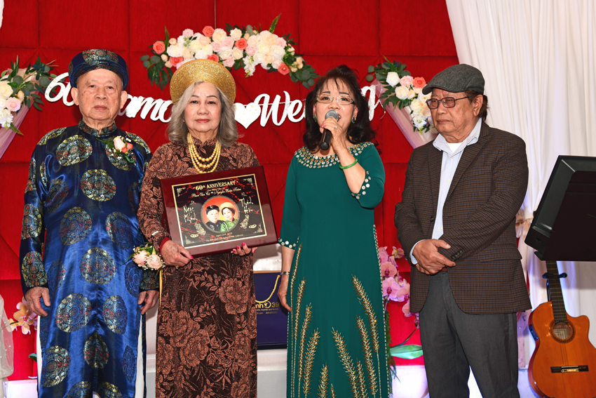 Anh Mai Đức Phú và chị Thu Tâm đại diện Gia Đình QGNT Bắc California đã lên sân khấu để kính tặng thầy cô tấm plaque kỷ niệm và hai giọng ca QGNT Anh Tài và Lệ Hằng đã hát tặng thầy cô bài hát rất hay và ý nghĩa. Chị Thu Tâm cũng ngâm thơ kính tặng thầy cô nhân ngày vui kỷ niệm 60 năm.