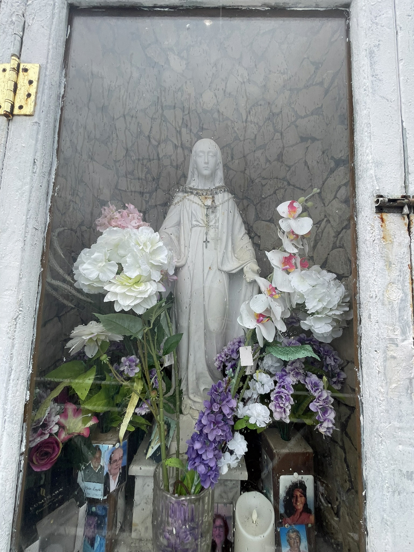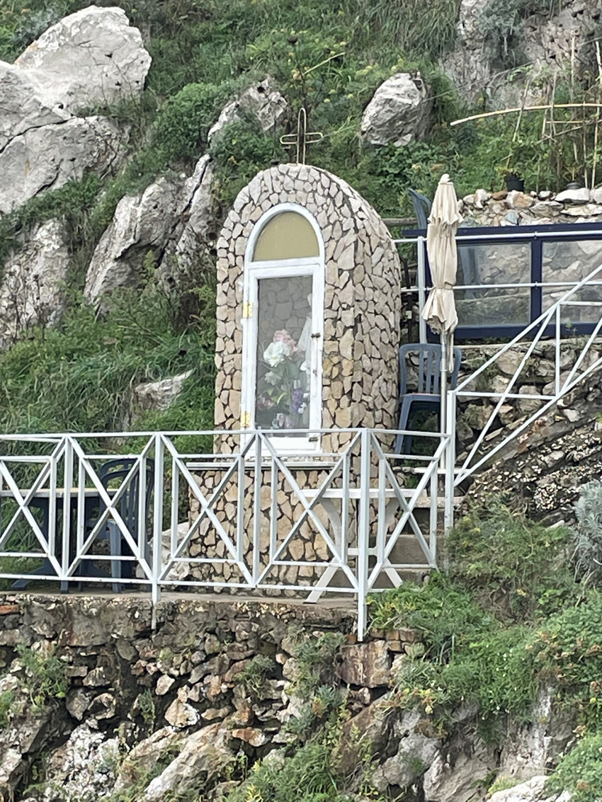 Ngay trên cửa hang, có bàn thờ để tượng Đức Mẹ, người ta nói để che chở cho du khách bên dưới.