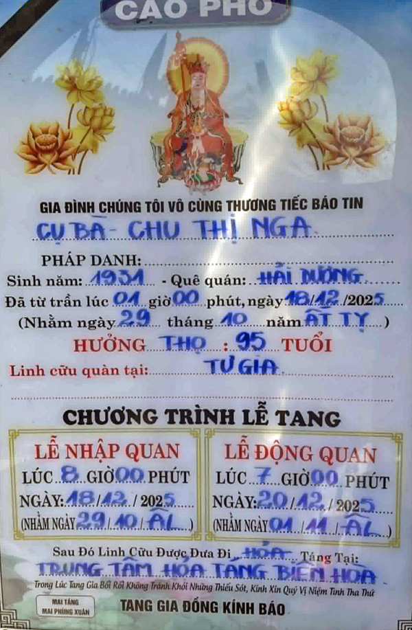 Đã tạ thế vì tuổi già sức yếu vào lúc 01h00 Ngày 18/12/25.