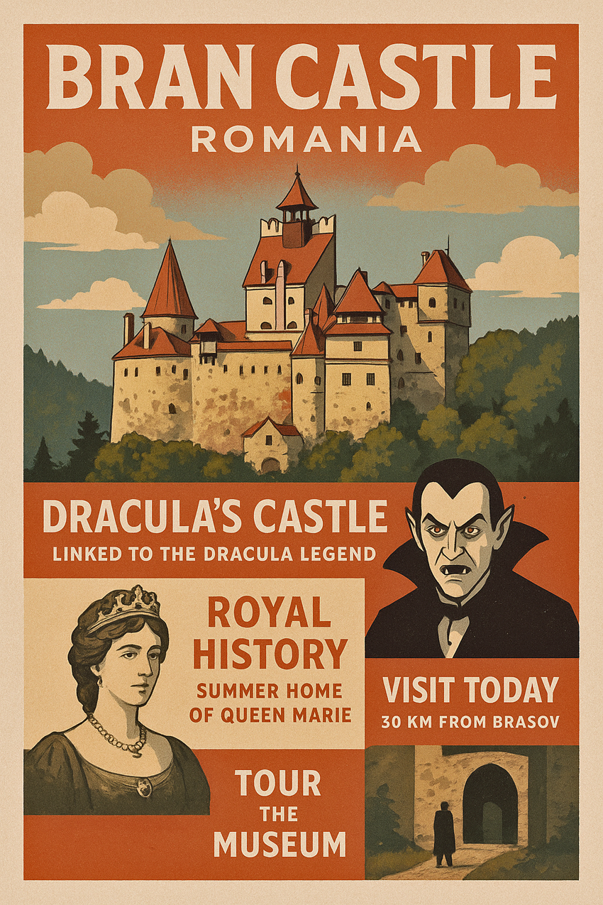 Lâu đài Bran được quảng bá rộng rãi là "Lâu đài Dracula" vì nó phù hợp với sự mô tả hư cấu của Bram Stoker trong tiểu thuyết "Dracula" năm 1897 của ông.