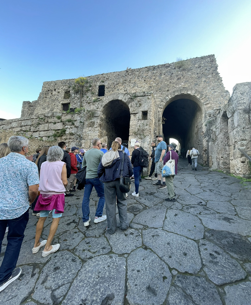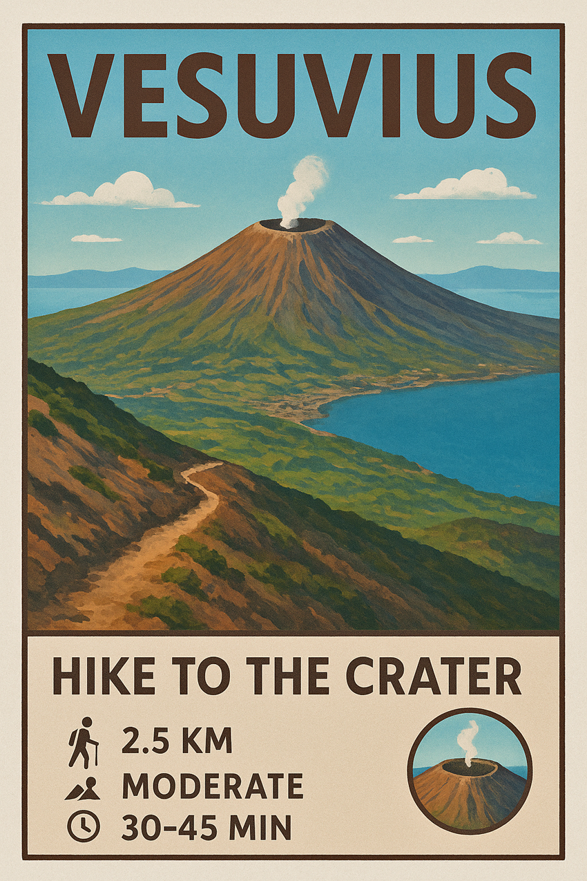 - Từ Pompeii, du khách có thể đi xe bus lên trạm bán vé leo núi Vesuvius. Từ đây du khách có thể đi bộ lên đỉnh núi ngay miệng của núi lửa. Việc đi bộ lên đỉnh núi Vesuvius là một trong những trải nghiệm phổ biến nhất gần Pompeii! 🌋