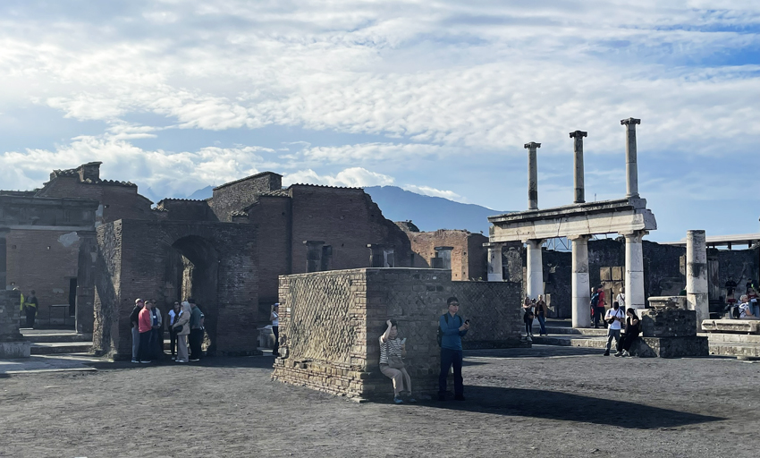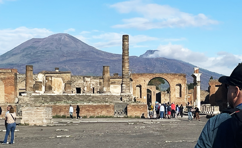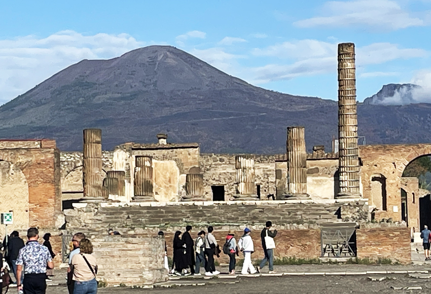 Tàn tích thành phố Pompeii với ngọn núi lửa Vesuvius xa xa.