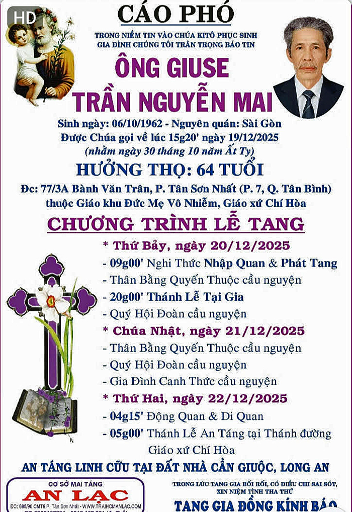 Nhận được tin buồn từ Gia Đình QGNT-SG, em trai của bạn Trần Nguyễn Thanh (Q75-TH), anh Giuse Trần Nguyễn Mai (Q75-Lớp 7) đã từ trần vào lúc 15 giờ 20, ngày 19 tháng 12 năm 2025, tại Việt Nam, hưởng thọ 64 tuổi.