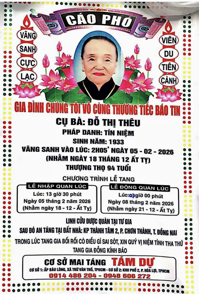 Nhận được tin buồn từ Gia Đình QGNT-SG, thân mẫu của bạn Biện Thị Ánh (Q75), Cụ bà Đỗ Thị Thêu pháp danh Tín Niệm đã vãng sanh vào lúc 2 giờ 05, ngày 05 tháng 02 năm 2026, tại Việt Nam, hưởng thượng thọ 94 tuổi.