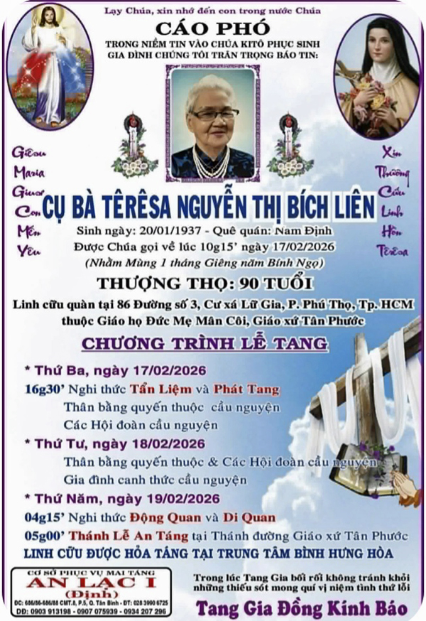 TIN BUỒN Trong Niềm Tin Vào Chúa KiTô Phục Sinh! Gia Đình QGNT(SG) trân trọng báo tin. Nhạc Mẫu của Anh Phan Sĩ Tuấn (Q71). Cụ Bà Têrêsa Nguyễn Thị Bích Liên. Sinh Năm: 1937 Đã được Chúa gọi về vào lúc 10h15 Ngày 17/02/26 (Mồng 1 Tháng Hiêng Năm Bính Ngọ). Hưởng Thượng Thọ: 90 Tuổi. Kính Mời quý ACE cố gắng sắp xếp thời gian cùng đến chia buồn, tiễn đưa Cụ Têrêsa Nguyễn thị Bích Liên về nơi an nghỉ cuối cùng!! Vào lúc 10h00 Ngày 18/02/26. Xin hiệp lời cầu nguyện linh hồn Cụ Bà Têrêsa Nguyễn Thị Bích Liên sớm về hưởng Nhan Thánh Chúa!! Thành Kính Phân Ưu cùng AC Phan Sĩ Tuấn (Q71)- Chị Thu và Gia Đình!