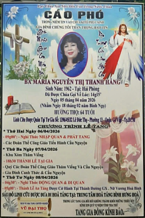 Nhận được tin buồn từ Gia đình QGNT-SG. em gái của chị Nguyễn Thị Thanh Ngà (Q75), chị Maria Nguyễn Thị Thanh Hằng (Q75) đã được từ trần vào lúc 14 giờ15 ngày 05 tháng 04 năm 2026, tại Việt Nam, hưởng thọ 64 tuổi.