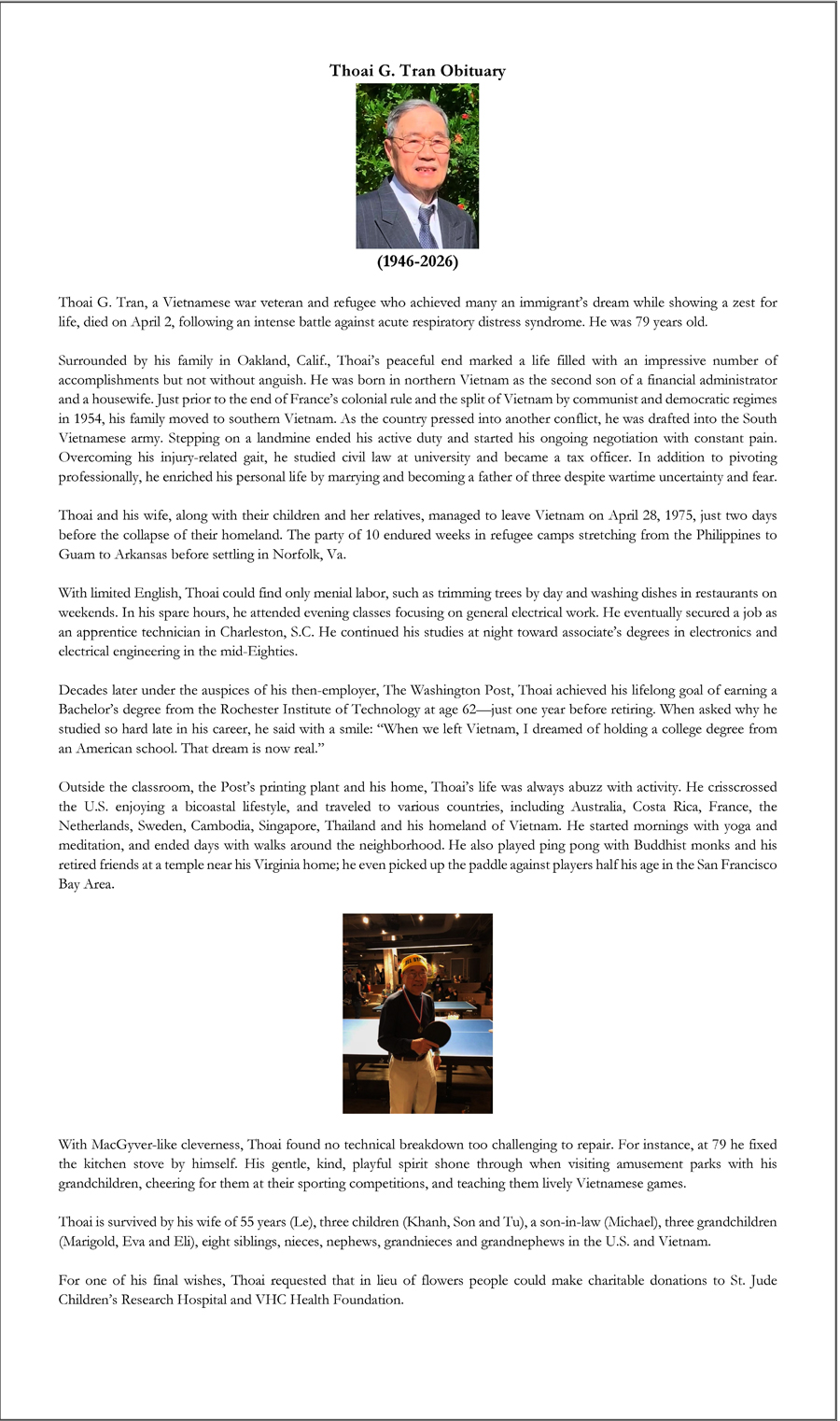 We have been deeply comforted by the kind words you have shared about our beloved father, Thoai G. Tran. We would be honored to have you join us to commemorate his life on the weekend of May 22–23, 2026. Please find below the details on the Buddhist 49th Day Memorial on May 22 and Celebration of Life lunch on May 23. We kindly request an RSVP for the lunch by May 10. 49th Day Memorial for Thoai G. Tran In Buddhist tradition, the 49th day after death marks the end of an important transitional period for a loved one’s consciousness. It represents the period when the soul is reborn. Buddhists believe actions performed by the living can help the loved one during this transition. The actions help the spirit move peacefully onward. The Tran family will perform weekly rituals during these 49 days to support our beloved’s journey. The 49th Day Memorial and Celebration of Life for Thoai G. Tran on the weekend of May 22-23 will honor his life, the completion of his transition, and his rebirth. Friday, May 22, 2026, 7:00-8:00 PM 49th Day Memorial Service Pho Tu Buddhist Temple (Chua Pho Tu) 17327 Meekland Ave., Hayward, CA 94541 https://maps.app.goo.gl/XHmdwgFSX6nYS6FM6?g_st=ic (Conducted in Vietnamese. Attendance is optional.) Saturday, May 23, 2026, 11:00 AM - 2:00 PM Celebration of Life Lunch Pacific Lighthouse Restaurant 1051 Pacific Marina, Alameda, CA 94501 https://maps.app.goo.gl/4NHHhxZoWBHnfJHy9?g_st=i RSVP by May 10 We are preparing a slideshow for the Celebration of Life. Please feel free to email us photos and short videos or upload them to this link: by May 10 We also invite you to bring memories to share during the lunch or printed photos to include in a memory book for his grandchildren. The Tran Family Contact Info Tu Tran 415-378-5719 Le Tran 703-869-6808 Background on the Buddhist 49th Day Memorial: Understanding the 49 Days of Mourning (https://mbtchicago.org/ask-rev-todd-2024-09-03/) The Significance of Rebirth in Buddhism (https://nirvanamemorialsg.com/what-is-the-49-days-of-mourning-in-buddhism/)
