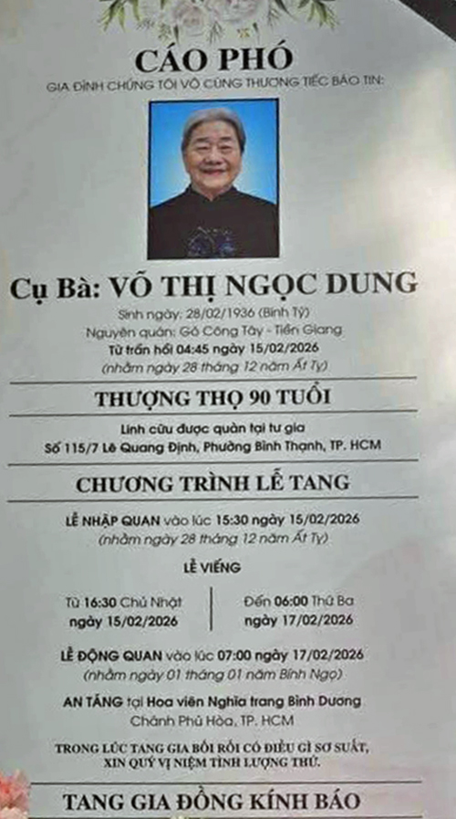 Nhận được tin buồn từ Gia đình QGNT-SG, Cô Võ Thị Ngọc Dung (cựu Giáo Sư trường QGNT-SG) đã vãng sanh vào lúc 04 giờ 45, ngày 15 tháng 02, năm 2026, tại Việt Nam, hưởng thượng thọ 90 tuổi.